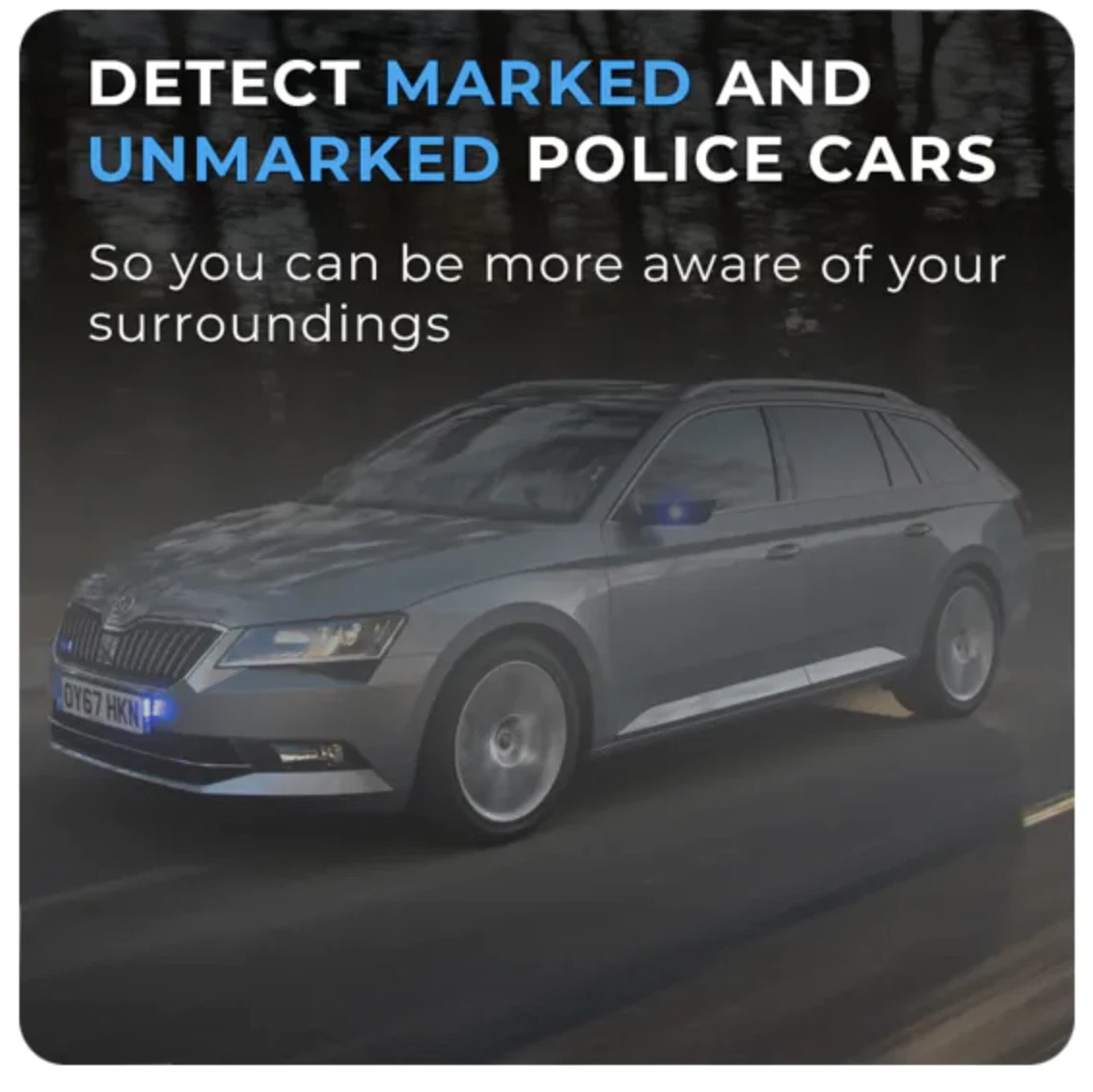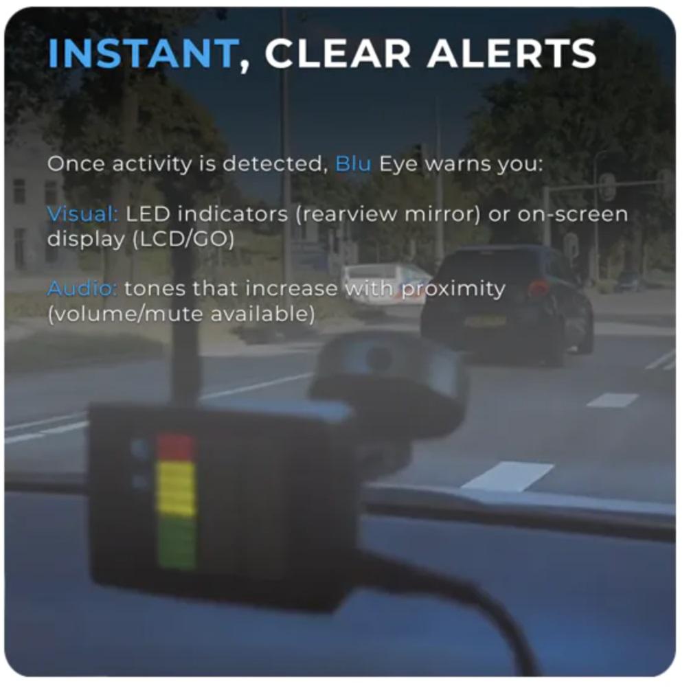Blu Eye GO detects the radio signals of (unmarked) police vehicles, fire engines, and ambulances in your vicinity, even if they are not using sirens or flashing lights. Blu Eye GO warns you in time, so you can anticipate traffic calmly and with better awareness.