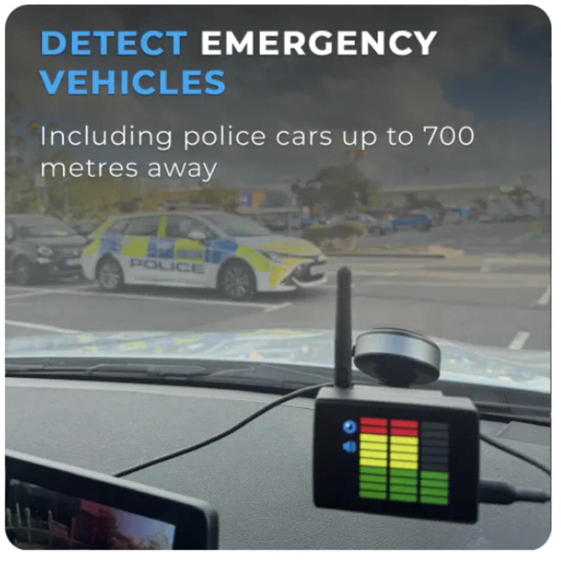 The system detects the radio signals of nearby emergency vehicles including unmarked police cars, fire engines, and ambulances.  Even if they are not using sirens or flashing lights.